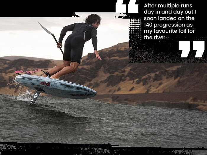 After multiple runs day in and day out I soon landed on the 140 progression as my favourite foil for the river. I played around with multiple tails but also found the 13.5 progression tail to be ideal. The river in my opinion is a terrible place to test equipment as after time I felt every foil worked there. People were riding surf foils and also super high aspect foils. It is though a great place to learn your fundamental downwind skills like paddling up and learning what bump to take and what to let go. It also teaches you how to surf downwind as the river is so peaky like a skatepark bowl.